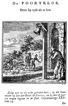 Description: A man tolls the bell next to the city gate; two men, a woman, a child, and a dog run along the wall of the city to reach the gate before it closes. The Dutch artist and poet Jan Luiken (1649-1712), whose initials are at the lower right, was responsible for drawing and etching this emblem, as well as for the poem that accompanies it (below).