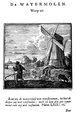 Description: A watermill stands on the dike of a lake. On the field in the foreground a man regards the mill and a sheep grazes; a church is located in the distance. The Dutch artist and poet Jan Luiken (1649-1712), whose initials are at the lower right, was responsible for drawing and etching this emblem, as well as for the poem that accompanies it (below).