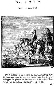 Description: The mailman sits on a horse with a heavy pack tied behind his saddle to which a horn and a dagger are attached. Two men discuss the mailman. A village can be seen in the distance on the other side of a river. The Dutch artist and poet Jan Luiken (1649-1712), whose initials are at the lower right, was responsible for drawing and etching this emblem, as well as for the poem that accompanies it (below).