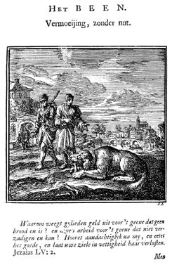Description: In the foreground two men watch a large dog gnaw on a bone. The background consists of a city view. The Dutch artist and poet Jan Luiken (1649-1712), whose initials are at the lower right, was responsible for drawing and etching this emblem, as well as for the poem that accompanies it (below).