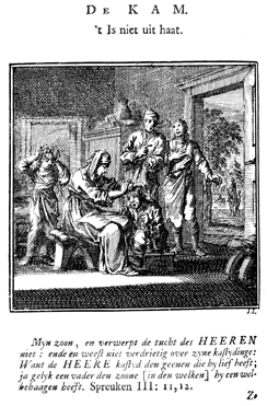 Description: In a room, a young child screams while her mother uses a comb to delouse her hair. A second child awaits his turns, while two adults comment on this scene. A street view can be observed through the open door. The Dutch artist and poet Jan Luiken (1649-1712), whose initials are at the lower right, was responsible for drawing and etching this emblem, as well as for the poem that accompanies it (below).