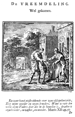 Description: A traveler is welcomed at the front step of a house with friendly gestures of its inhabitants. A gate is located at the left background. The Dutch artist and poet Jan Luiken (1649-1712), whose initials are at the lower right, was responsible for drawing and etching this emblem, as well as for the poem that accompanies it (below).