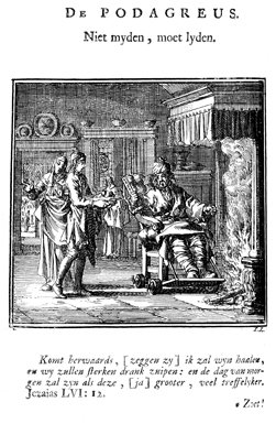 Description: In a Dutch interior, a gout sufferer sits with both legs bandaged in a wheel-chair next to a hot burning fire. A servant offers him a plate full of delicacies, while a woman in the room expresses surprise about this scene. The Dutch artist and poet Jan Luiken (1649-1712), whose initials are at the lower right, was responsible for drawing and etching this emblem, as well as for the poem that accompanies it (below).