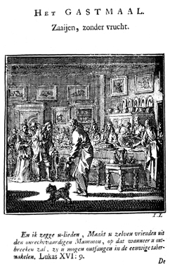 Description: In a richly furbished banquet hall numerous splendidly attired guests are already seated at a large table which is loaded with dishes with food, while the host and his dog welcome two new guests. The Dutch artist and poet Jan Luiken (1649-1712), whose initials are at the lower right, was responsible for drawing and etching this emblem, as well as for the poem that accompanies it (below).