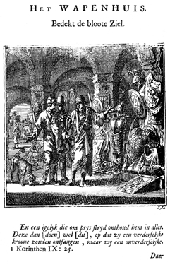 Description: A man shows two onlookers an exhibition of various shields, body armor, and other weaponry from antiquity. The exhibition hall has tall vaulted ceilings. The Dutch artist and poet Jan Luiken (1649-1712), whose initials are at the lower right, was responsible for drawing and etching this emblem, as well as for the poem that accompanies it (below).