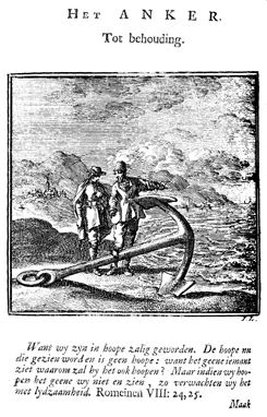 Description: A huge anchor lies on the beach; behind it a sailor talks to a hiker. In the left background is a village with a church. Several ships sail on the sea. The Dutch artist and poet Jan Luiken (1649-1712), whose initials are at the lower right, was responsible for drawing and etching this emblem, as well as for the poem that accompanies it (below).
