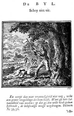 Description: A lumberjack wields an axe to fell a tree. In the background two men drag cut-up tree trunks away. The Dutch artist and poet Jan Luiken (1649-1712), whose initials are at the lower right, was responsible for drawing and etching this emblem, as well as for the poem that accompanies it (below).