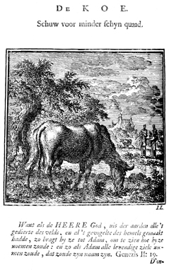 Description: A cow grazes in a meadow while a bird sits in front of her. Two women and more cows are in the distant meadow across a pond; a church can be seen in the far distance. The Dutch artist and poet Jan Luiken (1649-1712), whose initials are at the lower right, was responsible for drawing and etching this emblem, as well as for the poem that accompanies it (below).