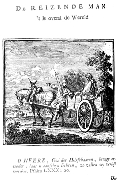 Description: A driver sits on a horse-drawn cart with his pack behind him and listens to the driver who points out a distant view. In the background are other travelers on horses. The Dutch artist and poet Jan Luiken (1649-1712), whose initials are at the lower right, was responsible for drawing and etching this emblem, as well as for the poem that accompanies it (below).