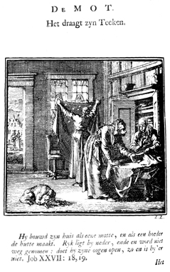 Description: In a room of a house, two women inspect a sheet in front of an open linen closet for signs of a moth. A third woman holds a sheet in front of the window to view the numerous moth holes. An open door shows a city view. The Dutch artist and poet Jan Luiken (1649-1712), whose initials are at the lower right, was responsible for drawing and etching this emblem, as well as for the poem that accompanies it (below). The attendant Scripture text is Job 27:18-19.