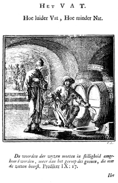 Description: In a cellar with steps leading up to the street a number of barrels are stored. One man kneels down and knocks on an empty barrel to let a second man hear the sound that emanates from it. A couple views this scene from the city street. The Dutch artist and poet Jan Luiken (1649-1712), whose initials are at the lower right, was responsible for drawing and etching this emblem, as well as for the poem that accompanies it (below).