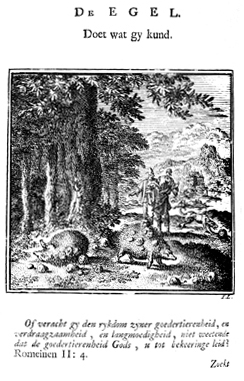 Description: Two men contemplate two hedge-hogs which are rolling on the ground in order to pick up fallen fruit. Behind the men a hedgehog is rolled into a ball to defend itself from an attack by a dog. The Dutch artist and poet Jan Luiken (1649-1712), whose initials are at the lower right, was responsible for drawing and etching this emblem, as well as for the poem that accompanies it (below).