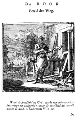 Description: A carpenter points to his drill while standing in front of his work bench. A hammer, a saw, a basket with nails, various other carpentry tools and pieces of wood lie on the ground next to the bench. A city scene can be seen in the background. The Dutch artist and poet Jan Luiken (1649-1712), whose initials are at the lower right, was responsible for drawing and etching this emblem, as well as for the poem that accompanies it (below).