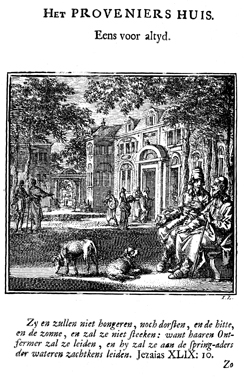 Description: Two old men talk with each other while sitting on a bench in front of the retirement community to which they surrendered their possessions in return for lifetime care. Several women enter the institution with platters of food. The Dutch artist and poet Jan Luiken (1649-1712), whose initials are at the lower right, was responsible for drawing and etching this emblem, as well as for the poem that accompanies it (below).