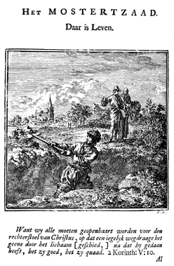 Description: A man throws the dirt on the side from the deep ditch he is digging, while a couple views the mustard seed that grows on the side. A church can be seen in the distance. The Dutch artist and poet Jan Luiken (1649-1712), whose initials are at the lower right, was responsible for drawing and etching this emblem, as well as for the poem that accompanies it (below).