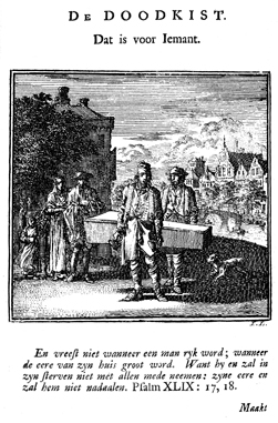 Description: On a street that runs along a canal, a family watches two workmen carry a coffin; large houses and a church are seen across the canal. The Dutch artist and poet Jan Luiken (1649-1712), whose initials are at the lower right, was responsible for drawing and etching this emblem, as well as for the poem that accompanies it (below).