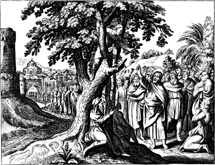 Description: Jesus speaks to Zacchaeus, who has climbed a sycamore tree in order to see Him.
