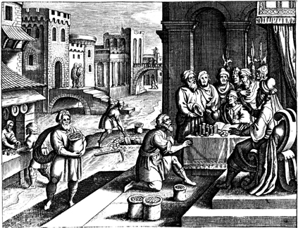 Description: The master returns and receives an accounting of his resources. In the background, one is depicted burying the talent.