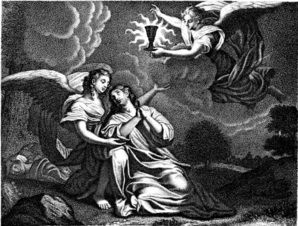 Description: Angels attend Jesus in the Garden of Gethsemane as he prays that his cup may pass. In the background, the inner circle sleeps.