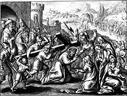 Description: Simon of Cyrene is ordered to carry Jesus' cross after Jesus falls under its weight.