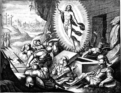 Description: Jesus rises from the dead at the amazement of the soldiers.