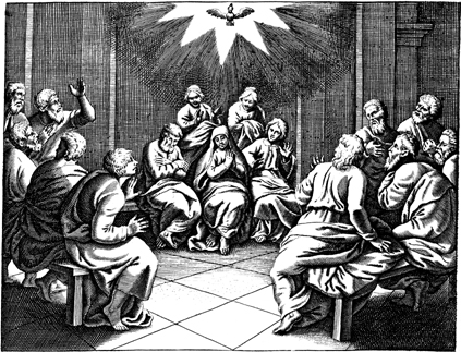 Description: The Holy Spirit descends on the disciples and Mary in the form of a dove on Pentecost.