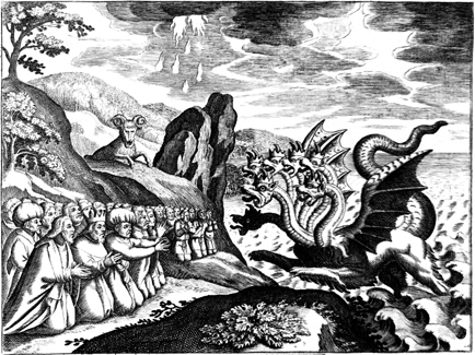 Description: All the people of earth, whose names are not in the book of life, worship the seven-headed beast emerging from the sea, as another beast emerges from the earth.