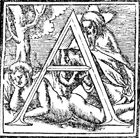 Description: An initial letter A featuring God creating Eve from Adam's side as he sleeps.