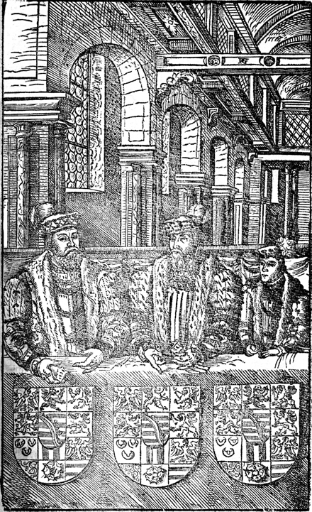 Description: An image of the three sons of John Frederick I, the Elector of Saxony (r. 1532-1547): to the left John Frederick II, the Duke of Saxony (r. 1554-1566); in the middle John William, the Duke of Saxony (r. 1566-1572) and the Duke of Saxe-Weimar (r. 1572-1573); and to the right John Frederick III, the Duke of Saxe-Gotha (r. 1554-1565). Below each is the family coat of arms.
