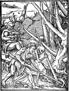 Description: Adam labors next to a skeleton (= Death) to bring forth fruit from the earth, as Eve feeds their child. An hourglass, the reminder of human mortality, rests on the ground between Adam and Eve. The 54 images of Hans Holbein's "The Dance of Death" (Lyon, 1538) were cut by Hans Luetzelburger and here appear in the 1547 Latin edition of the work.