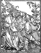 Description: A peasant hands a papal decree to a cardinal as a skeleton (= Death) pulls at the cardinal’s hat. The 54 images of Hans Holbein's "The Dance of Death" (Lyon, 1538) were cut by Hans Luetzelburger and here appear in the 1547 Latin edition of the work.