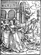 Description: As Death with the jester's cap and hourglass seizes the queen, her attendants struggle to free her from his grip. The 54 images of Hans Holbein's "The Dance of Death" (Lyon, 1538) were cut by Hans Luetzelburger and here appear in the 1547 Latin edition of the work.