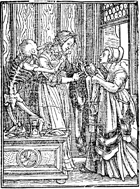 Description: A skeleton, representing death, places a necklace of bones around the neck of a countess. An hour-glass, representing time, sits on her table. The 54 images of Hans Holbein's "The Dance of Death" (Lyon, 1538) were cut by Hans Luetzelburger and here appear in the 1547 Latin edition of the work.