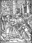 Description: A woman carrying a basket of goods is attacked in the forest by a robber. Death comes to her aid, however, ready to punish the evildoer for his cowardly act. The 54 images of Hans Holbein's "The Dance of Death" (Lyon, 1538) were cut by Hans Luetzelburger and here appear in the 1547 Latin edition of the work.