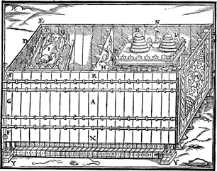 Description: The tabernacle frame and view of the interior of the tabernacle with ritual objects inside.