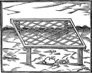 Description: The bronze grate for the altar of burnt offering with four rings at its corners.