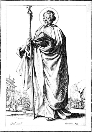 Description: A portrait of the Apostle Thomas holding his attribute, a spear and a bible. The etchings in this book were done by Jacques Callot (1592-1635) .