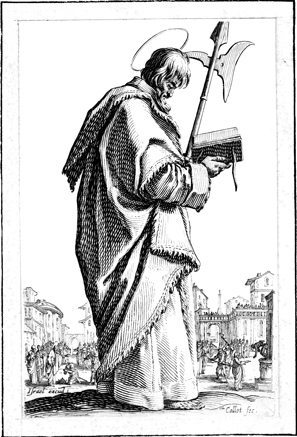 Description: A portrait of the Apostle Matthias with his attribute the axe. The Apostle Matthias replaced Judas Iscariot after Judas' betrayal. The etchings in this book were done by Jacques Callot (1592-1635).