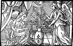 Description: The angel Gabriel visits Mary and announces that she will give birth to Jesus.