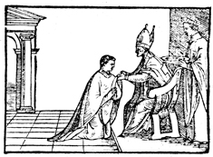 Description: This engraving illustrates the bishop giving a surplice to a new cleric. The bishop implores the cleric to “put on” the Lord and become a new man in righteousness and truth.