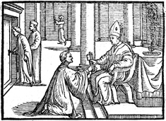 Description: This engraving illustrates ordination to the minor order of porter or doorkeeper, the first of seven ordinations culminating in full priesthood. The bishop gives a large key to the candidate for ordination, who kneels before him.