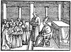 Description: This engraving illustrates one aspect of ordination to the third of three major orders: priesthood, the seventh and last of a series of ordinations culminating in full priesthood. The bishop, seated on his throne with an attendant priest at his side, speaks to the ordainees kneeling before him.