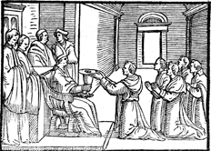Description: This engraving illustrates one aspect of ordination to the priesthood: the bishop, with attendants standing by his side, holds out a chalice and paten, a plate used to hold the host during Eucharist, to the newly ordained priest.