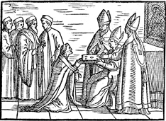 Description: This engraving is the ninth in a series of twelve illustrating the consecration of a new bishop. The bishop-elect, with his hands still bound within a long linen cloth, kneels before the presiding bishop. The latter offers the book of the Gospels to the bishop-elect and commissions him to preach.