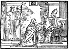 Description: The ceremony of bestowal of the pallium must take place in the new bishop’s own diocese. The pallium is a long woolen cloth embroidered with six small black crosses sent to the bishop by the pope. Here the new bishop kneels before the presiding bishop, who places the pallium over his chasuble, or priestly vestment.
