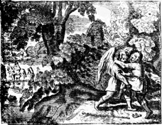 Description: After sending his family ahead of him (left), an angel appears to Jacob and wrestles with him throughout the night.