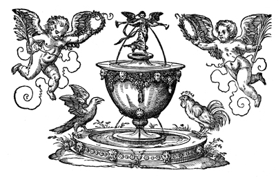 Description: This title-page vignette depicts two winged cherubs on either side of a fountain with an angel at the top. To the left is an eagle, and to the right is a rooster.