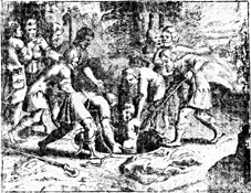 Description: Joseph’s brothers lift him out of a cistern, after deciding to sell him to the Ishmaelites for twenty shekels of silver (background).