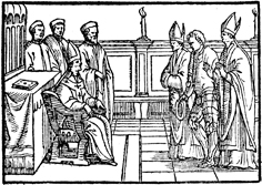 Description: This engraving is the first of ten illustrating the blessing and coronation of a king. The king-elect is led by auxiliary bishops before the metropolitan bishop seated on a throne.