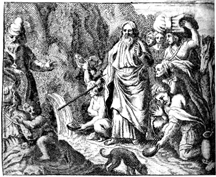 Description: Moses brings water from the rock at Meribah by following God’s command to strike the rock with the staff he used at the Nile.